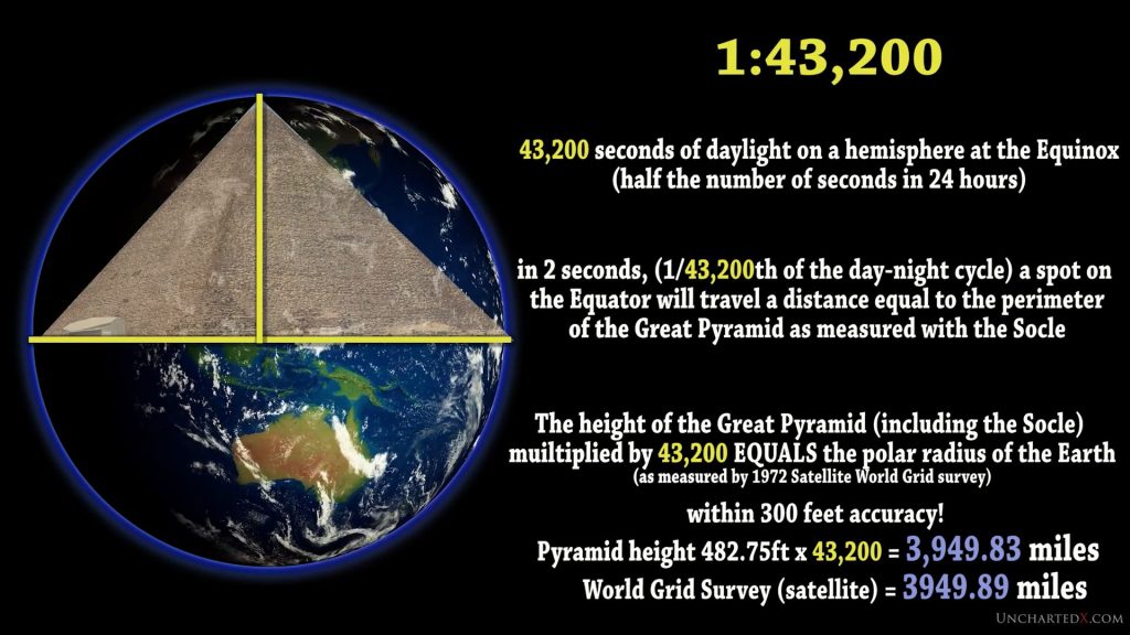Scaled up, this means the Great Pyramid directly corresponds to the circumference of the equator as well as the measurement from the equator to the pole, making it a scale model of the Northern Hemisphere. It’s divisible by exactly 43,200, which is a sacred number and equals 9, (4+3+2=9) which has a special meaning like Tesla said. Check out on Tesla’s incredible 369 method!